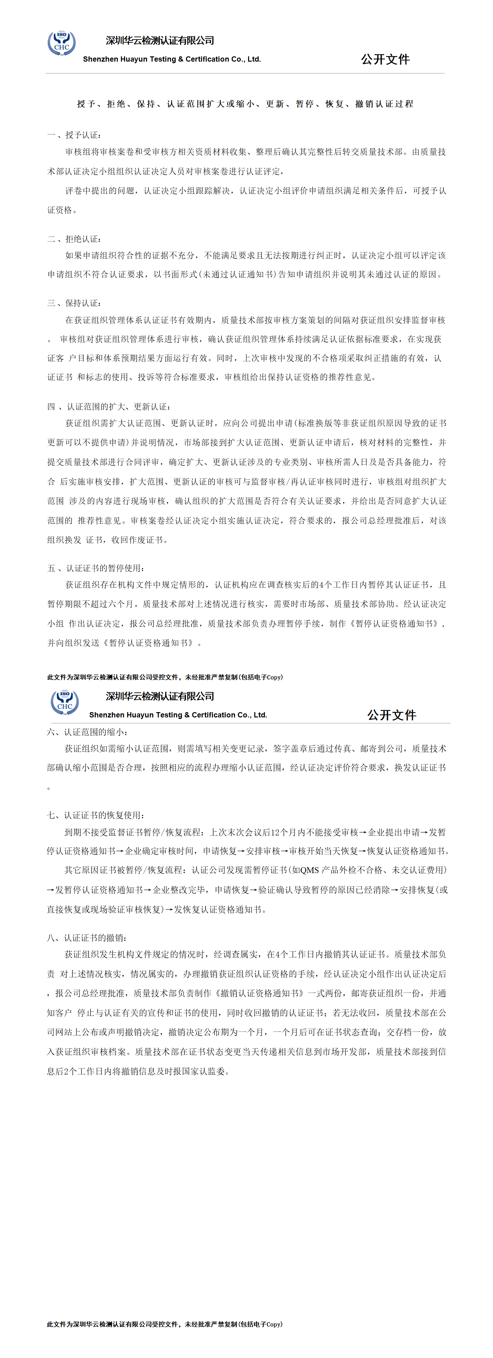 公开文件:授予、拒绝、保持、认证范围扩大或缩小、更新、暂停、恢复、撤销认证过程
